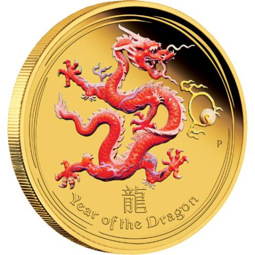 Золотая монета из серии "Лунный календарь" - год Дракона (с цветным изображением) выпущена Пертским монетным двором в 2012 году. Ограниченный тираж.