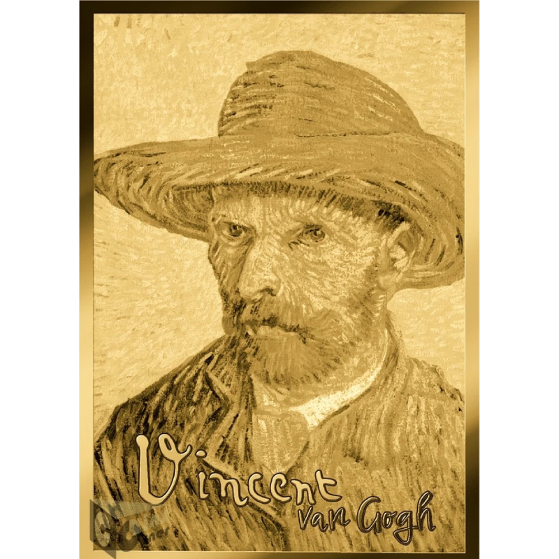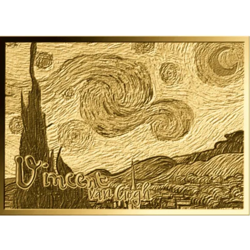 Эта потрясающая золотая монета весом 1/1000 унции посвящена картинам Винсента Ван Гога. У нее размеры 11 Х 15.4 мм и качество пруф-лайк. Поставляется в карточке с сертификатом подлинности. Тираж: 50 000 штук.