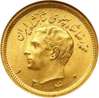 На аверсе золотой монеты изображен профиль шаха Мохаммеда Реза Пахлави, обращенный влево. Сверху обозначение его титула, снизу - год выпуска (1339 год хиджры = 1960 г. от Р.Х.).