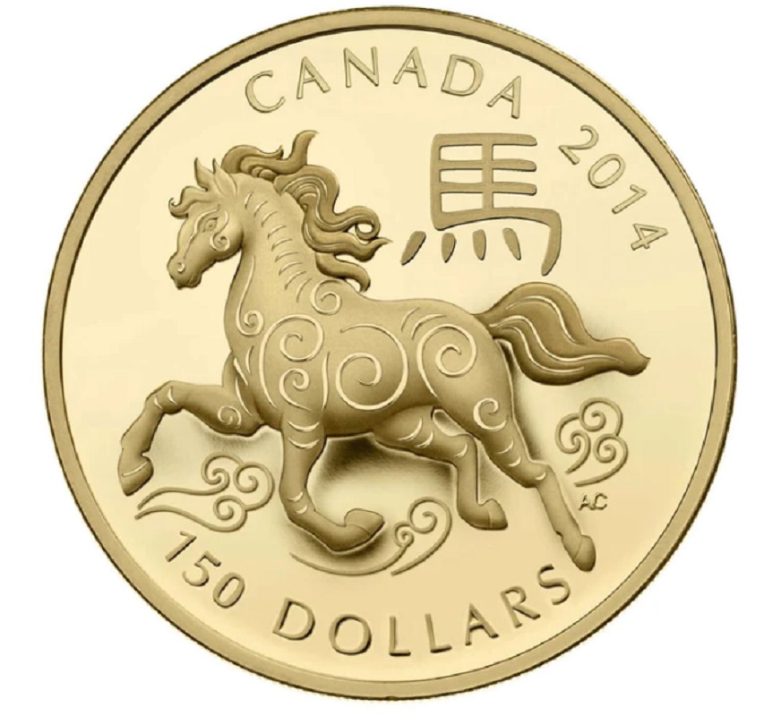 Золотая монета Канады, посвященная символу 2014 года - лошади.
