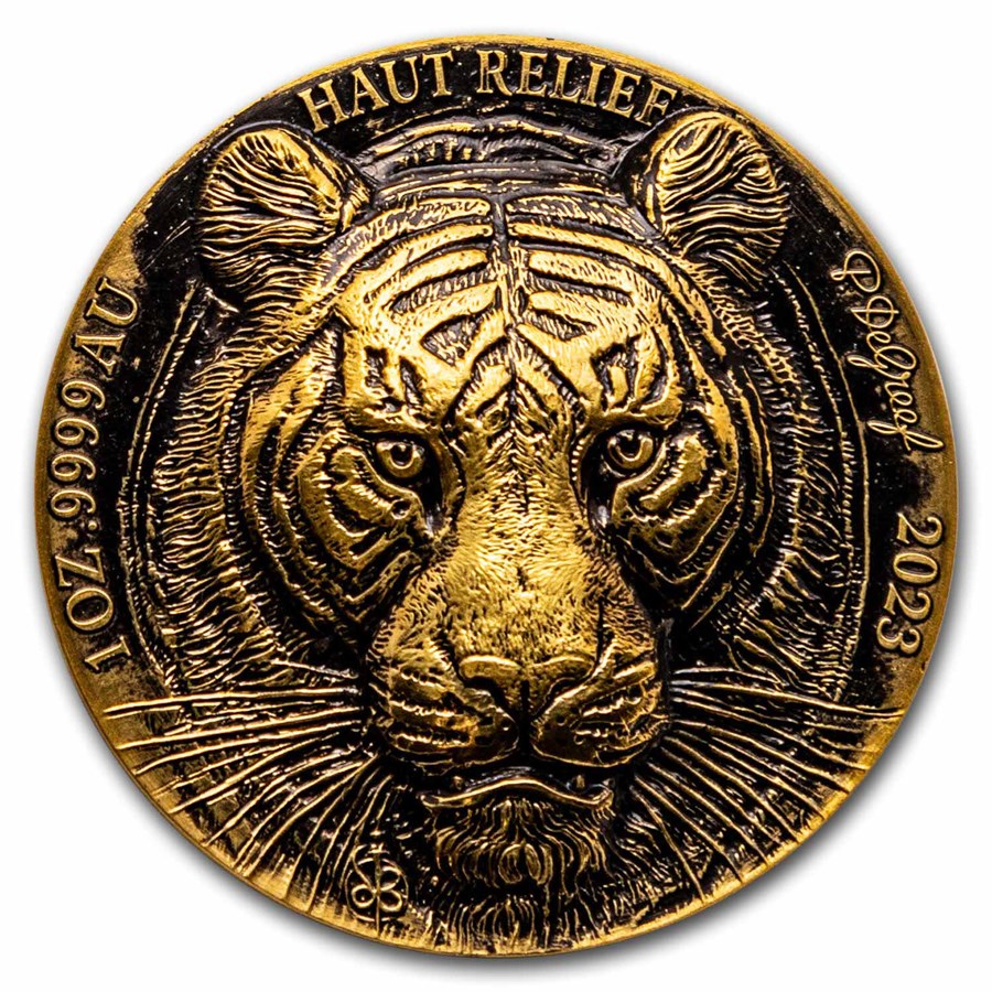 На реверсе монеты изображено впечатляющее детально проработанное изображение морды тигра. Вверху реверса надписи: «1 OZ .9999 AU» — вес монеты и проба золота, «HAUT-RELIEF» — означает «High Relief» на французском языке и «TIGER» — название монеты.