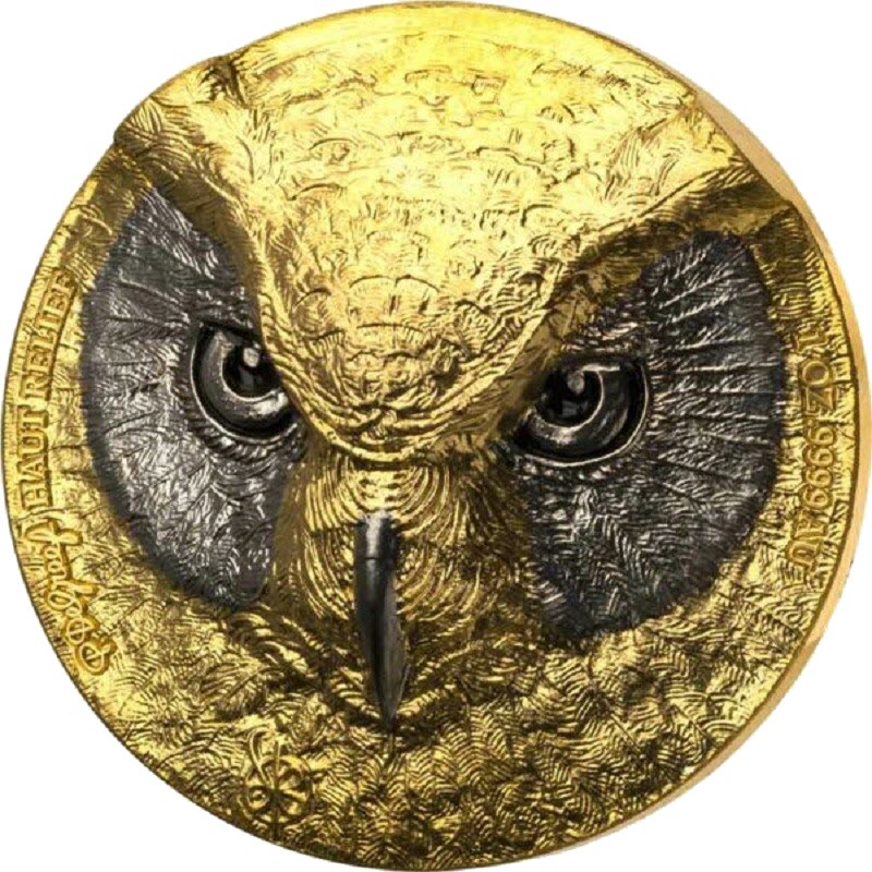 На реверсе монеты изображен крупный план великолепной совы. Птица смотрит прямо в глаза зрителю и имеет детальное оперение, отчеканенное в рельефе. Эта красивая золотая монета также включает цветные аппликации из белого и черного родия, что делает ее единственной в своем роде. По всему реверсу надписи: «HAUT-RELIEF» — что означает высокий рельеф, и «1 OZ .999 AU» — вес монеты и проба золота.