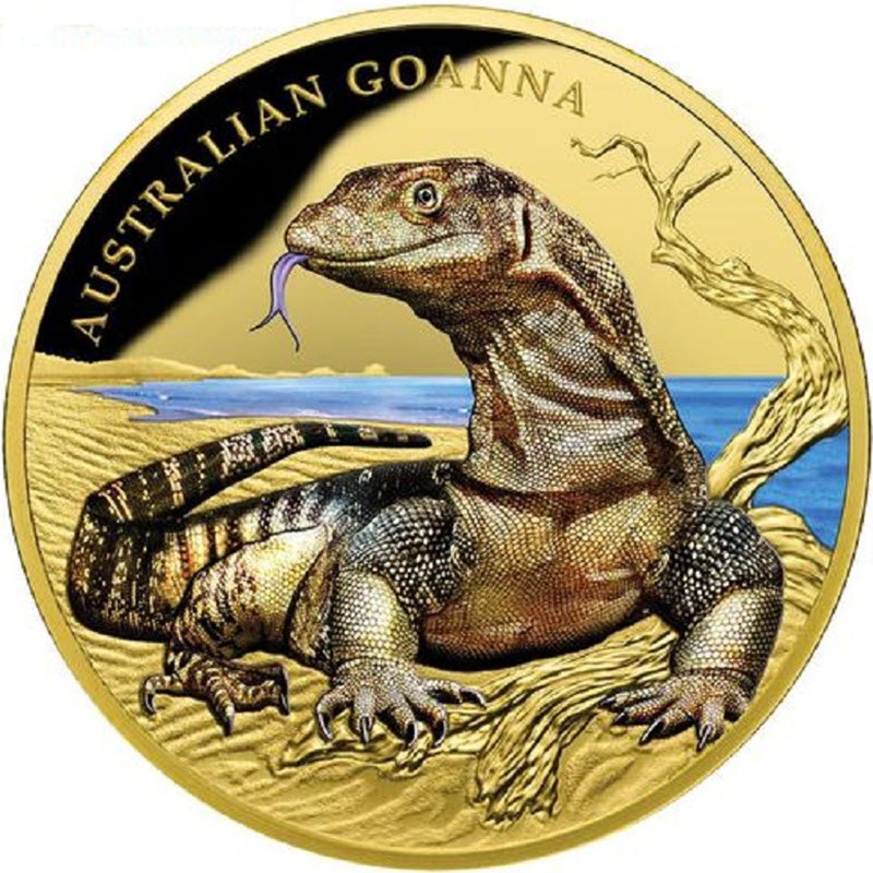 Цветное изображение грозного варана на пустынном берегу водоема. Надпись — AUSTRALIAN GOANNA.