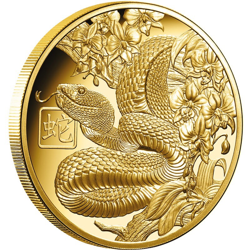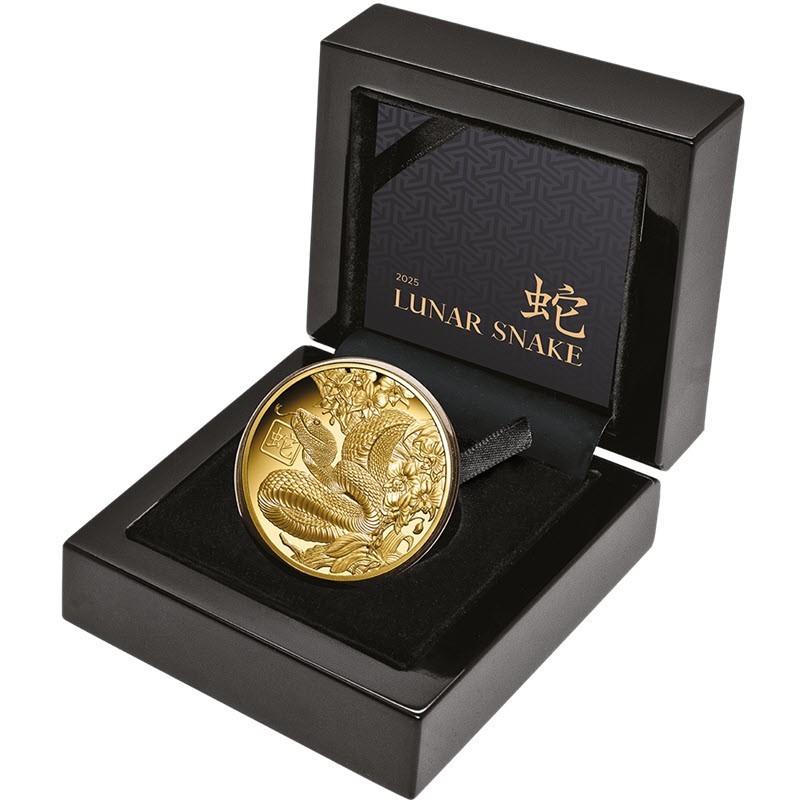 Золотая монета весом 1 унция посвящена символу 2025 года - Змее. У нее качество пруф. Поставляется в оригинальном футляре с сертификатом подлинности. Тираж: 150 штук.