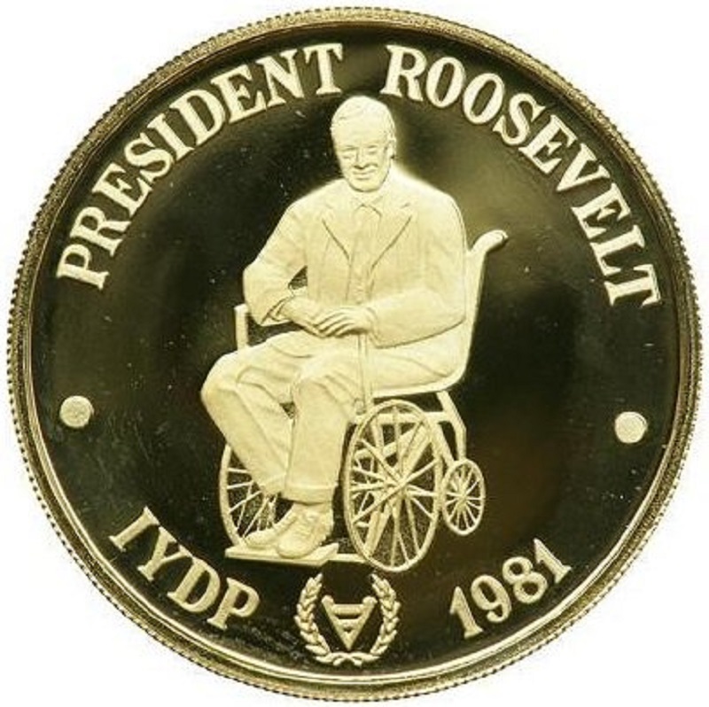 Золотая монета, выпущенная к проведению ООН Международного года инвалидов.