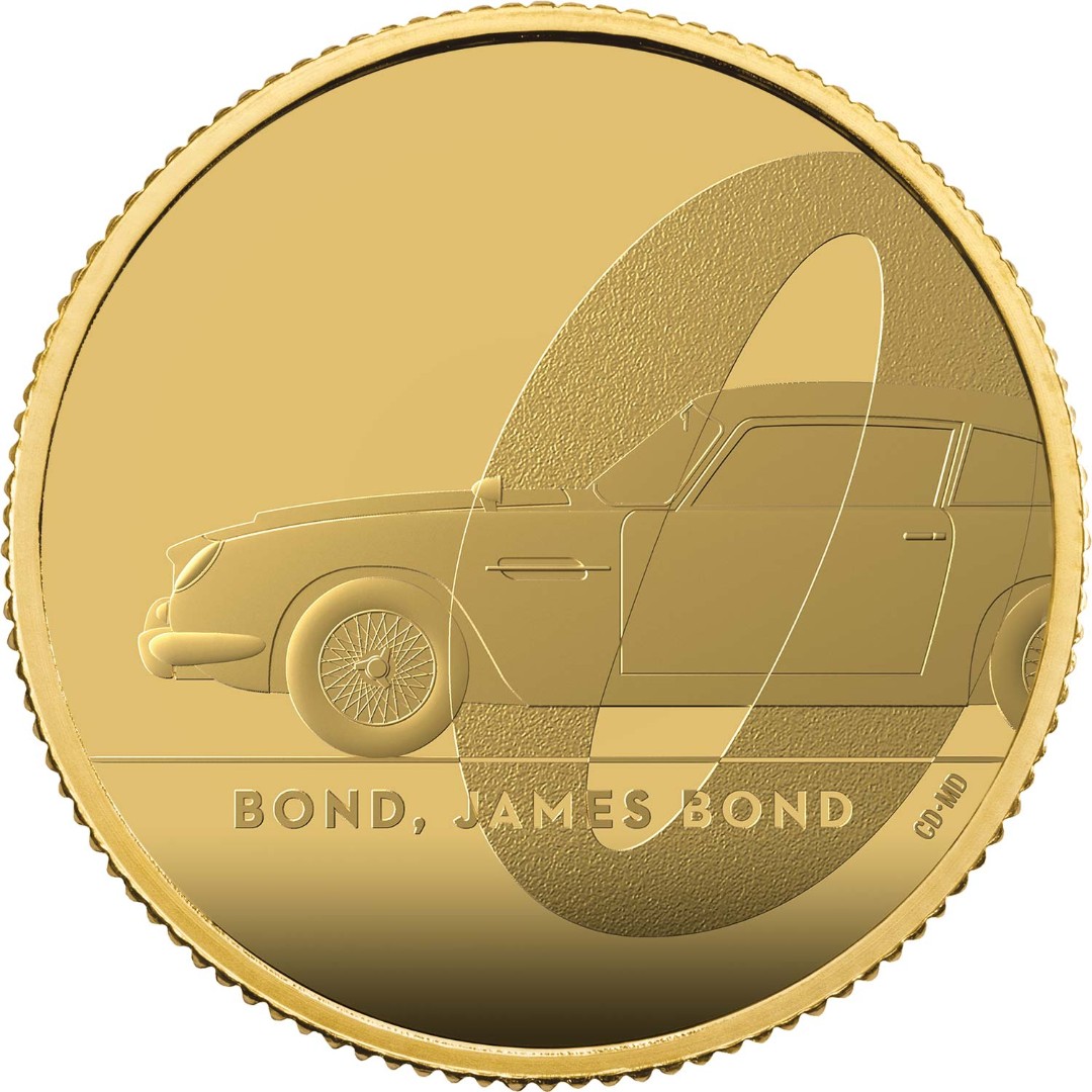 Легендарный автомобиль Бонда — Aston Martin DB5, наложенный на ноль. Надпись — BOND, JAMES BOND. Инициалы граверов — CD-MD (Мэтт Дент и Кристиан Дэвис)