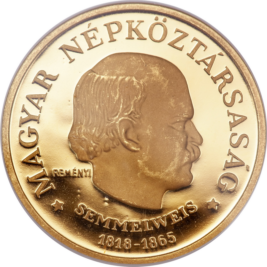 Золотая памятная монета с номиналом в 200 форинтов была выпущена в Венгрии в честь 150-тилетия со дня рождения выдающегося врача-акушера, профессора, одного из основоположников асептики - Игнаца Филиппа Земмельвайса (1818-1865). Ограниченный тираж.