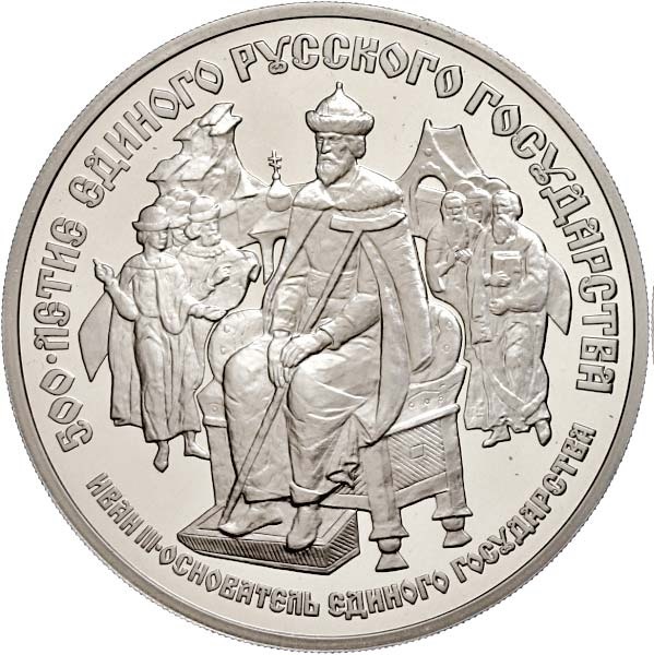 На реверсе изображен Иван III, великий князь Московский на троне, а за ним расположились князья и свита. По ободу вверху кругом стоит надпись: «500-ЛЕТИЕ ЕДИНОГО РУССКОГО ГОСУДАРСТВА». По ободу внизу кругом отчеканено следующее: «ИВАН III ОСНОВАТЕЛЬ ЕДИНОГО ГОСУДАРСТВА».