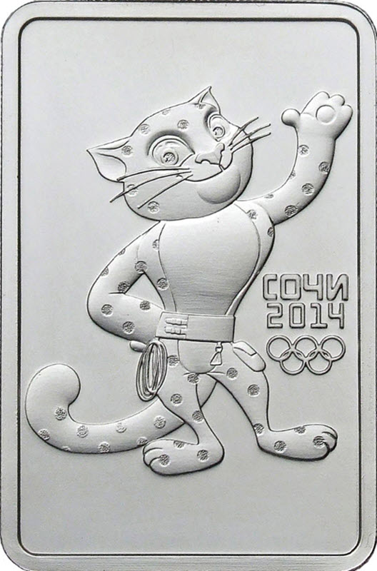 Реверс: рельефное изображение Леопарда - официального талисмана XXII Олимпийских зимних игр 2014 года в г. Сочи, справа в две строки надпись "СОЧИ" и дата "2014", под ними - пять олимпийских колец.