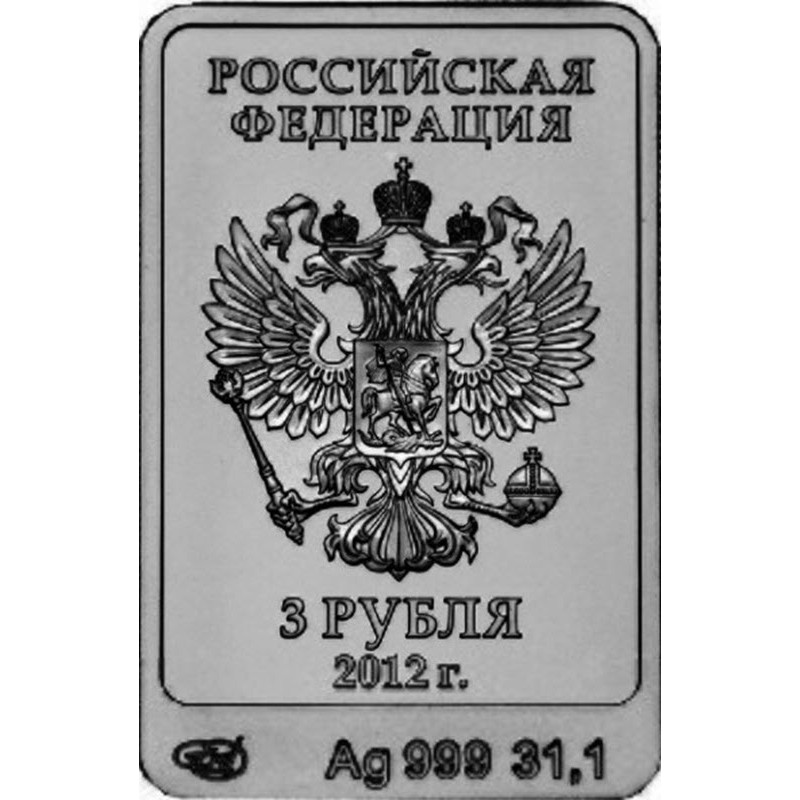 Аверс: в центре - рельефное изображение Государственного герба Российской Федерации, над ним - надпись в две строки: "РОССИЙСКАЯ ФЕДЕРАЦИЯ", под гербом в две строки - номинал монеты: "3 РУБЛЯ" и год выпуска: "2012 г.", внизу вдоль канта обозначения: слева - товарного знака монетного двора, в центре - металла по Периодической системе элементов Д.М. Менделеева и пробы сплава, справа - содержания драгоценного металла в чистоте.
