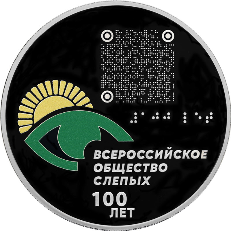 Российская серебряная монета 2025 г. Банка России весом 1 унция посвящена 100-летию Всероссийского общества слепых. У нее качество пруф и селективная окраска. Тираж: 5000 штук.