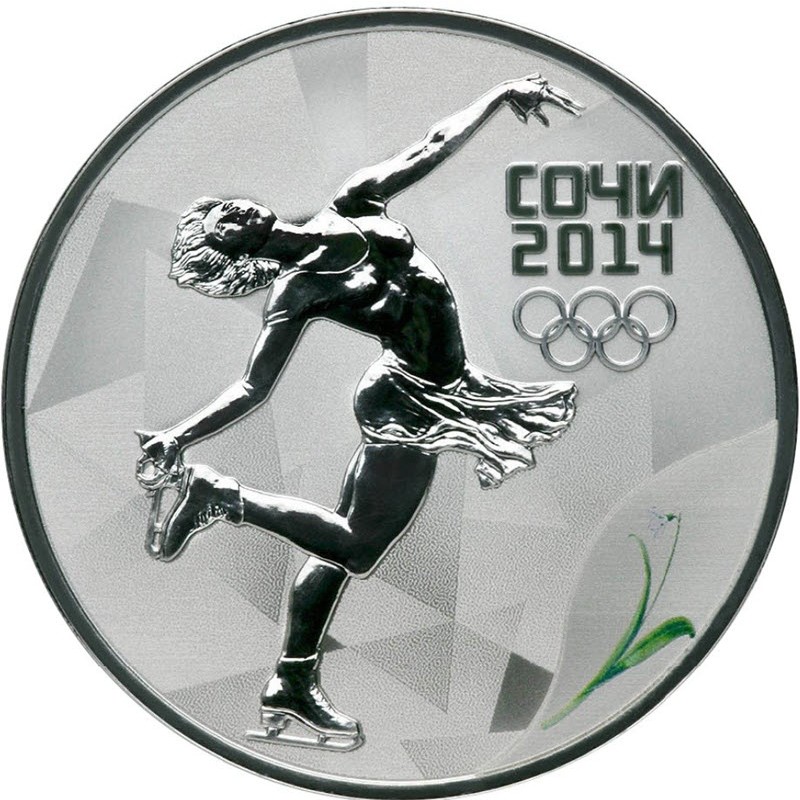 На реверсе изображена фигуристка на льду. Справа надпись: СОЧИ 2014 и пять олимпийских колец. Внизу справа цветное изображение соцветия подснежника Воронова.