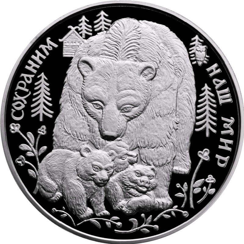 Серебряная монета из серии «Сохраним наш мир» весом 1 килограмм чистого серебра. Бурый медведь обитает на Кавказе, Камчатке, в Сибири и Приморском крае на Дальнем Востоке. Длина его тела достигает 2,5 метров, вес - свыше 300 кг. Всеядное животное, численность которого сокращается.