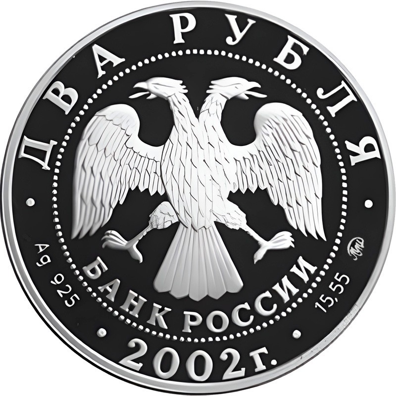 В центре - эмблема Банка России, под ним надпись полукругом - БАНК РОССИИ. Надписи по кругу: вверху - ДВА РУБЛЯ (номинал), внизу - 2002 г. (год чеканки), слева - Ag 925 (проба серебра), справа — 15,55 ММД (вес серебра и монограмма монетного двора).