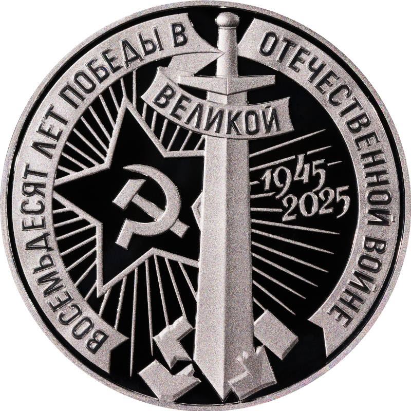 На реверсе изображен меч на фоне солдатской звездочки и дат: 1945 2025. Вдоль канта надпись: ВОСЕМЬДЕСЯТ ЛЕТ ПОБЕДЫ В ВЕЛИКОЙ ОТЕЧЕСТВЕННОЙ ВОЙНЕ.