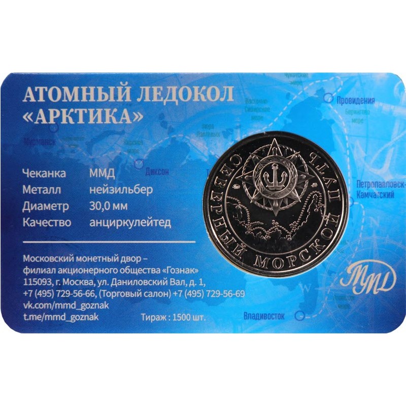 Медно-никелевый жетон ММД 2025 года посвящен 50-летию введения в эксплуатацию атомного ледокола «Арктика». У него качество анциркулейтед. Поставляется в блистере. Тираж: 1500 штук.