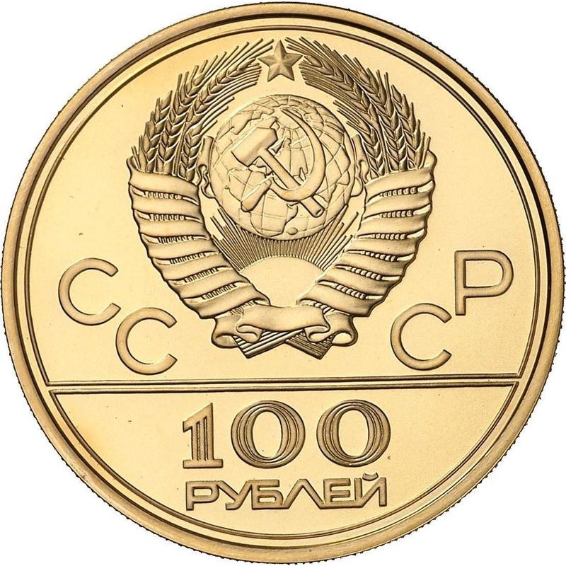 Золотая монета 100 рублей с изображением эмблемы Олимпиады на фоне земного шара и лавровой ветви, входит в состав серии из шести золотых монет «Игры XXII Олимпиады», выпуск которых был приурочен к проведению Олимпийских игр в Москве.