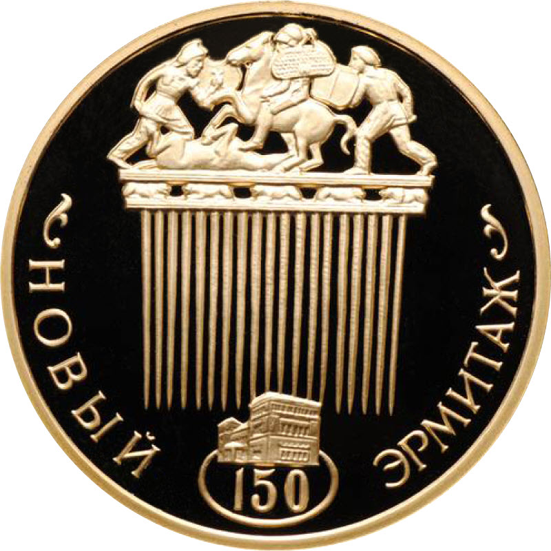 золотой скифский гребень из кургана Солоха (IV в. до н.э.), внизу по окружности - надпись: "НОВЫЙ ЭРМИТАЖ", разделенная датой в овале - "150", над ней - здание Нового Эрмитажа.