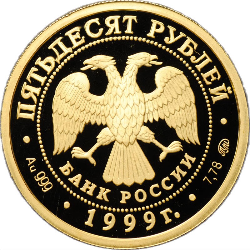 На аверсе изображена эмблема Банка России (двуглавый орел с опущенными крыльями). Под орлом надпись: БАНК РОССИИ. Вдоль канта надпись: ПЯТЬДЕСЯТ РУБЛЕЙ • Au 999 • 1999 г. • 7,78 ММД • (номинал, вес и проба золота, год чеканки, монограмма монетного двора).