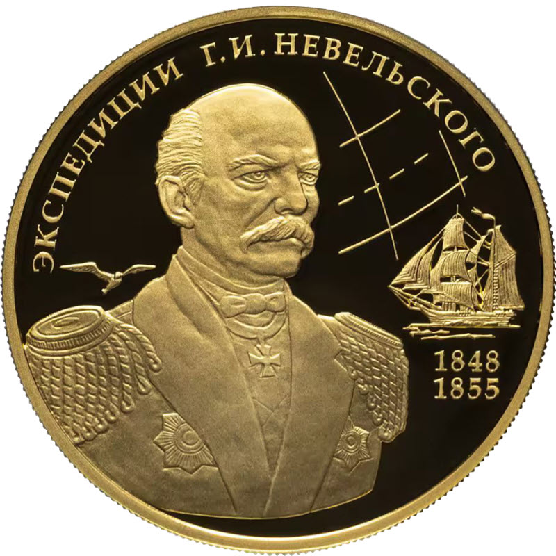 Золотая памятная монета России, посвященная экспедиции Г.И. Невельского на Дальний Восток в 1848-1849 и 1850-1855 гг. Московский монетный двор.