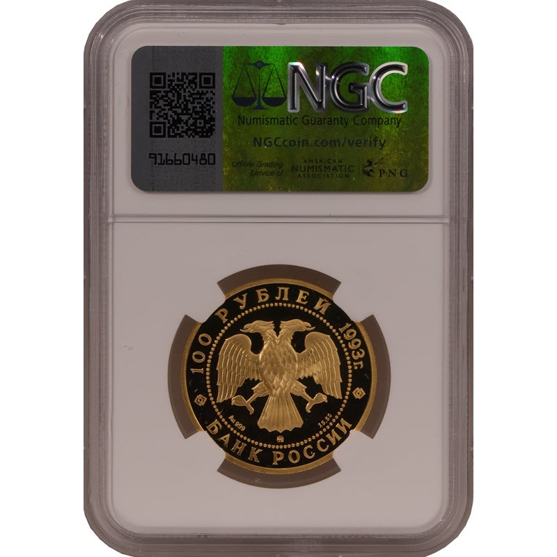 На аверсе изображен герб Банка России (двуглавый орел  с опущенными крыльями). Под ним надпись: Au 999 ММД 15,55 (вес и проба золота, монограмма Московского монетного двора). Вверху вдоль канта надпись: 100 РУБЛЕЙ 1993 г. (номинал, год чеканки), внизу: БАНК РОССИИ.