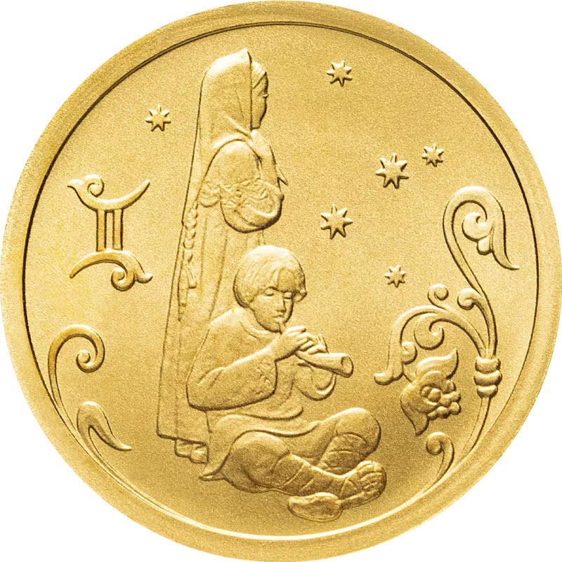 изображения девочки и мальчика на фоне звезд,стилизованных ветвей растений и знака зодиакального созвездия Близнецов.